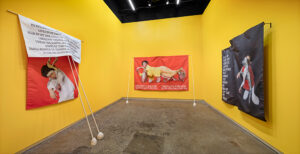 My Need For Civility Impedes This As I Shot Harsh Looks Towards Those Who Can’t Seem To Follow The Rules, 2019. Inkjet print on polyester, painted steel, painted aluminium, urethane rubber; 238,8 x 315,6 x 114,3 cm. Performer: Winnie Ho.