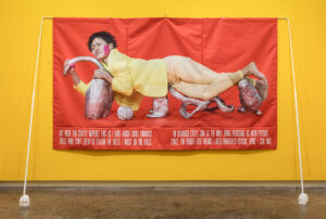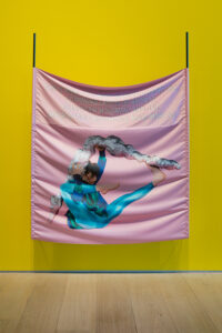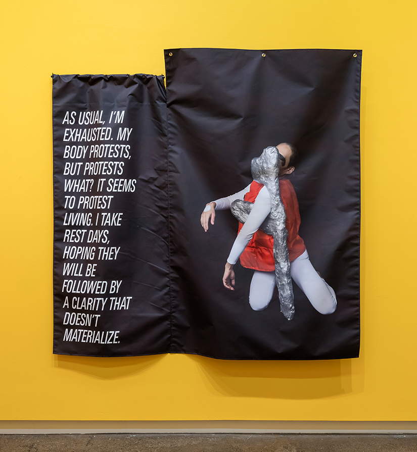 As Usual, I’m Exhausted, 2019. Inkjet print on polyester, painted steel, urethane rubber; 147,3 x 186,1 x 10,2 cm. Performer: Winnie Ho.