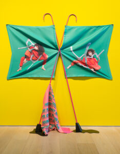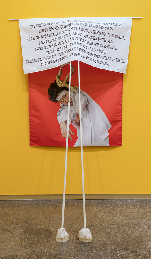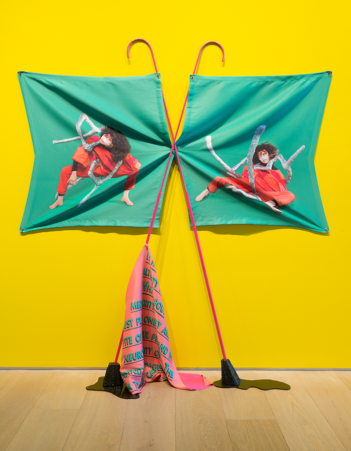 Its Eyeless Stare Says: ‘We Are All A Bit Damaged’, 2019. Inkjet print on polyester, painted steel, painted aluminium, urethane rubber; 241,3 x 152,4 x 114,3 cm. Performer: Winnie Ho.