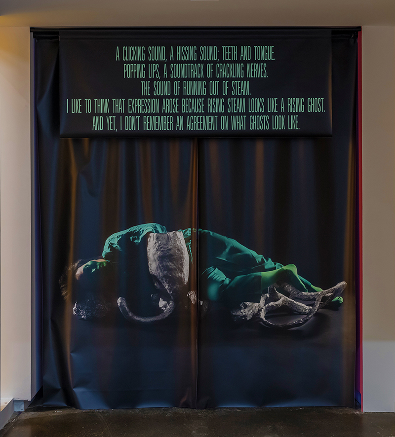 A Clicking Sound, A Hissing Sound; Teeth And Tongue, 2019. Inkjet print on vinyl; 251,5 x 216 cm. Performer: Winne Ho.