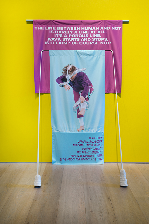 180_lumdesranleaustills20202 The Line Between Human and Not Is Barely a Line at All, 2020. Inkjet print on polyester, painted steel, urethane rubber; 249 x 122 x 76 cm. Performer: Olive Bieringa.