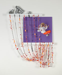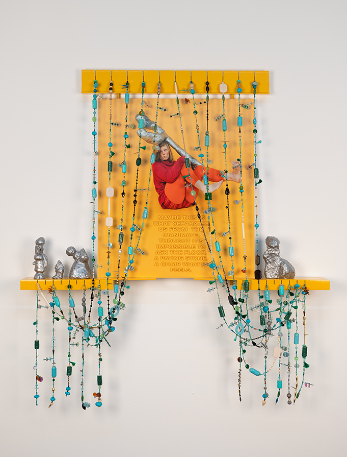 180_lumdesranleaustills20232 Maybe This Is What Separates Us from the Inanimate, 2023. Inkjet on paper laminated on Dibond, powder coated steel, paper mâché, plaster, paint, mixed media; 114,2 x 105,3 cm. Performer: Deborah Dunn.