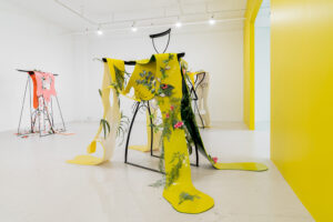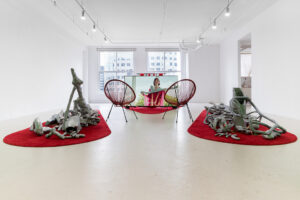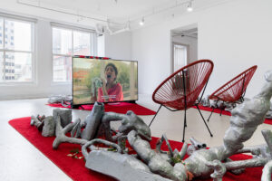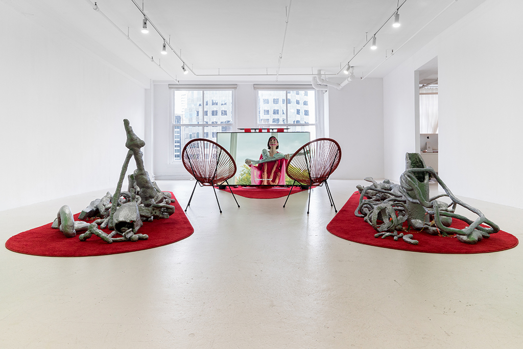 Installation: Paper mâché, Forton, styrofoam, acrylic paint, powder coated steel, urethane rubber, fabric, rugs, Acapulco chairs, artificial plants, mixed media.